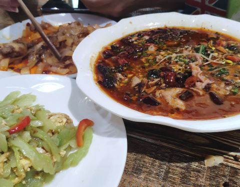 这两天的宜宾实在是太热,想在住处附近随便找个馆子。下来看到这家最近,于是就进去点了几个菜。馆子不大不小,看上去很普通。虽然开了空调,但是不怎么管用,坐着吃饭都在飙汗。回锅肉一般,火候不够。水煮肉片和苦瓜炒蛋将就。随便吃一下填肚子还行,对味道和环境有要求的还是换一家。