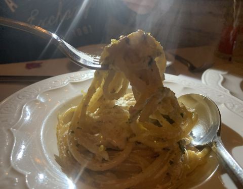 - 真的是已经夸到不能再夸的意大利小馆了,环境温馨菜品好吃服务棒。馅料湿湿软软,和薄脆的饼身非常搭
