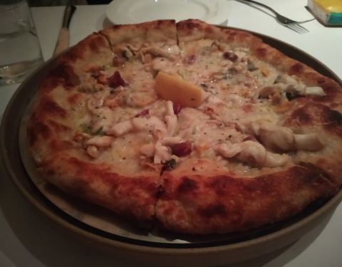 情调也非常不错,蛤蜊pizza,很丰富的配料,量很多,龙虾意面,奶油很多,味道偏甜,炸小鱿鱼可...