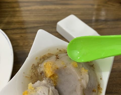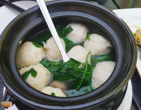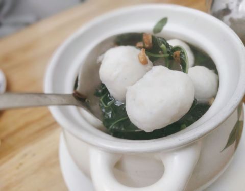 |鲨鱼丸枸杞叶汤^丸子Q弹,从口感上就能吃出是纯手工制作,配合枸杞叶熬汤喝,非常养身