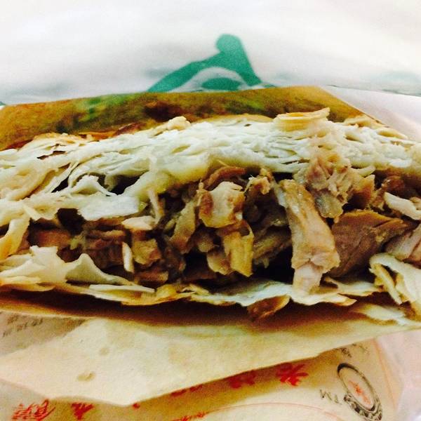 离酒店半站地铁的地方有华润万家,找到了觅食的地方了,是一个很low的美食城,看着当地人挺多的就尝试了,味道出奇的好啊 要了油泼菠菜面7块和酸汤饺子8块,在上海就一直心心念念菠菜面,比想象中的颜色淡,面条口感很好,油泼还真心以为只有辣油,还有些豆腐小菜的配菜,吃的好撑。酸汤水饺,8块钱24个,又是撑死的节奏,已经是小碗了怎么还有辣么多虽然吧,包饺子的同志收了钱之后没洗手又淡定的包着他的饺子想着人家都是这么吃的如果不拉肚子那我也就不讲究了。。。没想到第二天没拉肚子而且这个酸汤是我吃过的饺子汤里最最最美味的了,汤底喝了个底朝天,大概和包饺子收银的同志热情的给我加了点蒜蓉也有点关系吧想着第二天早上要去太白山,买了个潼关优质肉夹馍8块钱当第二天早饭,热乎乎的新鲜出炉的实在不忍放着它冷去,咬上一口便又觉得这是我人生中吃过的最好吃的肉夹馍知道潼关肉夹馍的特点是饼皮脆,居然可以那么脆,这千层的水平好高超,虽然很撑很撑可还是啃了好几口,真是欲罢不能,不是没吃过肉夹馍,只是这个太赞了,再吃下去我大概就可以激动流泪了。