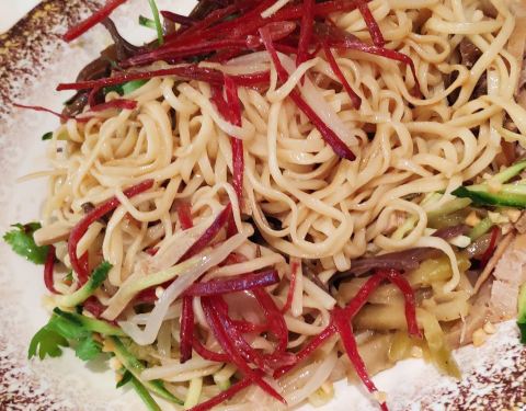 开在静安寺外墙的素菜馆,名声在外,不过很长一段时间我一直以为这是寺庙自己开的。 一楼是快餐和面包,点菜需上楼。我们就楼下选快餐了,顾客很多。收银发货有一点乱,饭菜要自己端上桌。点了招牌的面和饭,还有冷面,感觉颜色很漂亮,味道还不错,就是吃多了,素菜毕竟不如荤菜带劲儿。偶尔尝试吧,话说现在吃素也不便宜,三人小一百没了。