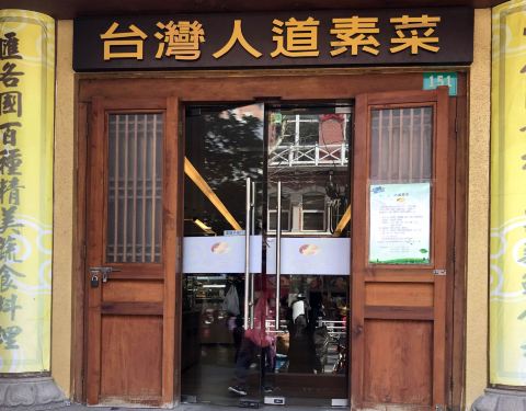 台湾人道素菜馆门口对联上写着:汇各国百种精美蔬食料理 尝人间菜根果茎新鲜食材。菜品新鲜,味道清爽