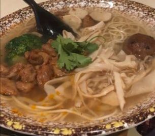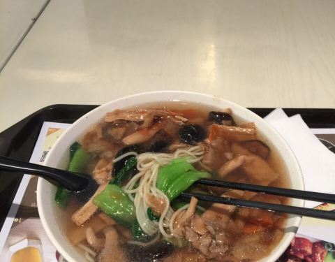 在2楼吃过自助,一楼买过面包,这次来尝试素食,赶上阴历二月十九菩萨生日,人还不少。 有很多选择,最后选择了招牌素面,35元。猴头菇、笋等,笋片薄而爽口。 还有一杯茶、一份泡菜和一份水果。 适合一人食,是夏天女生们的另一种选择。 收银阿姨有点耳背,只顾忙自己的,旁边老阿姨问他青团怎么卖都不理人家,服。