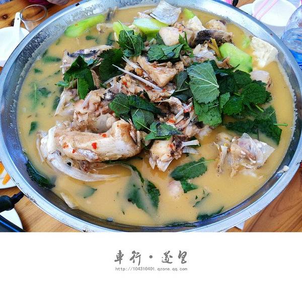 哈哈…… 有些事真是无巧不成书, 我们瞎猫遇到了好耗子“焦滩姐妹鱼头馆”, 据说焦滩的鱼头很出名呢! 焦滩因鱼头而远近闻名, 日子久了,渐渐的,似乎“焦滩鱼头”成了这方土地的代名词。 但凡到过遂昌的游客,有一些不知道焦滩是何方圣地, 大多的还是听说过焦滩鱼头的,并且会慕名前往品尝一番。 焦滩鱼头是选用乌溪江里的生态鲢鱼,脑袋特大, 经过农家菜籽油文火煎至外焦里嫩, 然后放入乡下自制的豆腐和土生土长的黄瓜, 上面盖上薄荷叶,汤汁辣辣的,鲜鲜的,百吃不厌。 (网上摘录) 呃…… 怪不得,我吃的时候一直奇怪, 怎么有一股怪怪的味道, 一直怀疑是不是食料不新鲜! 原来这还是焦滩鱼头的特色之一,盖上薄荷叶, 弄出焦滩鱼头特色味。