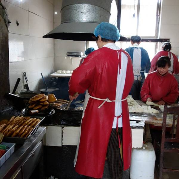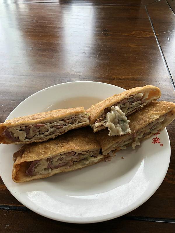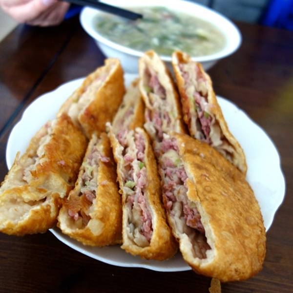 先推荐当地的美食——郓城何家壮馍 二两左右的牛肉馅,被和好的面包裹起来,擀成长方形,下油锅,经过先煎后炸再煎的过程,一个壮馍就做好了,外酥里嫩,层次分明,肉馅到边到沿,一层面一层肉。每个五两五的重量可以算的上是食物中的大块头。
