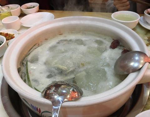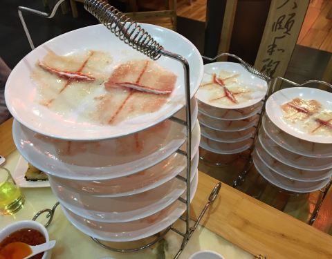 五个人点了四斤多的鱼,切成薄片足足装了4提盘子,看起来很多,其实一盘只有薄薄的两片,一烫就熟。清汤的锅,调料自已配,算是老少皆宜的鱼火锅。另外再点一些蔬菜,五人吃了260多,算是适中的价位