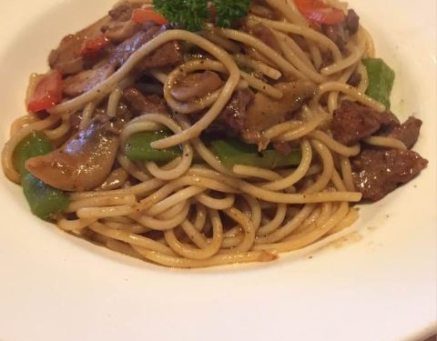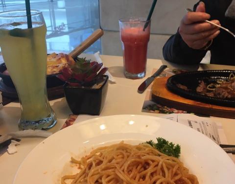 位于银泰四楼,周末和同事一起吃的,点了T骨牛排、超级披萨、意面、烤翅。味道很不错,推荐,下次还要去吃