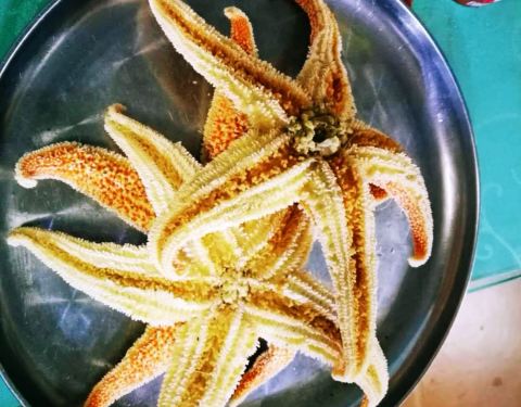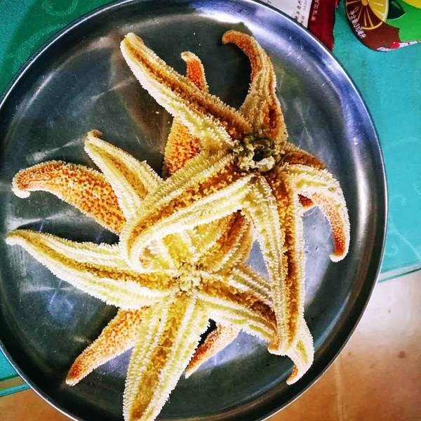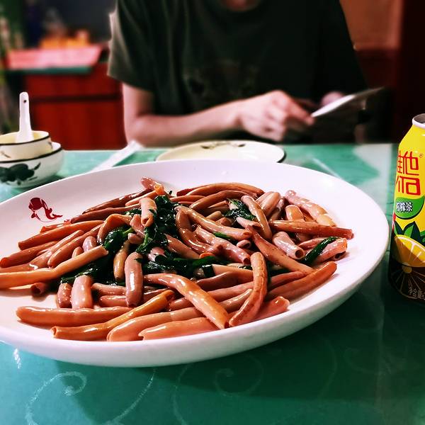小红鲸据说是莱山区排名第一的海鲜餐厅,离我们住的地方只有不到一公里,所以我们当然要到这里去尝一下。这家店不太好找,外面是绿色的建筑工地护栏,绕了一大圈才找到店。说实话店的装修什么的都很一般,感觉就是一家普通的家常馆子,这么有名一定是因为他家的味道特别好。我们两大一小,点了六个菜。来烟台前,在网上看到海肠是烟台的特色菜,当然不可以错过。海星也从来没吃过,点上!又点了葱烧海参、八爪鱼、海胆蒸蛋和一个素菜,最后又点了一个和脸差不多大的大馒头。不得不说烟台人民真的很实诚,菜量都是够够的,食材也都是真材实料。海肠确实是好东西,不过我们南方人从来没吃过,还真是无福消受,只斗胆吃了几根,白白浪费了。还等着,味道很醇厚,比我在三亚吃的鲜得多。海鲜的味道就有点怪怪的,我也觉得不太好吃。山东鲁菜用酱爆的烧法比较多,酱香浓郁。这一餐吃了不到500元,量实在是太大了,剩了一大半,以至于我们后来几餐每餐都只敢点三到四个菜。