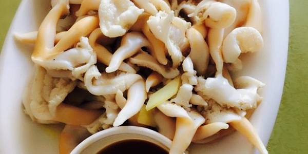 黄瓜拌扇贝边也是特色,好吃不贵。墨鱼饺子是特色,黑色的饺子皮,白色的馅,很是鲜美