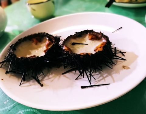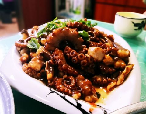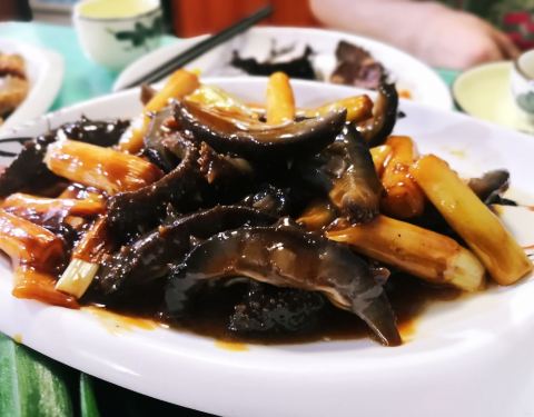 小红鲸据说是莱山区排名第一的海鲜餐厅,离我们住的地方只有不到一公里,所以我们当然要到这里去尝一下。这家店不太好找,外面是绿色的建筑工地护栏,绕了一大圈才找到店。说实话店的装修什么的都很一般,感觉就是一家普通的家常馆子,这么有名一定是因为他家的味道特别好。海鲜都放在店内,都是实物,整整齐齐地排列着。鲜活的海鲜让人一看就很有食欲。我们两大一小,点了六个菜。来烟台前,在网上看到海肠是烟台的特色菜,当然不可以错过。海星也从来没吃过,点上!又点了葱烧海参、八爪鱼、海胆蒸蛋和一个素菜,最后又点了一个和脸差不多大的大馒头。不得不说烟台人民真的很实诚,菜量都是够够的,食材也都是真材实料。海肠确实是好东西,不过我们南方人从来没吃过,还真是无福消受,只斗胆吃了几根,白白浪费了。还等着,味道很醇厚,比我在三亚吃的鲜得多。海星的味道就有点怪怪的,我也觉得不太好吃。山东鲁菜用酱爆的烧法比较多,酱香浓郁。这一餐吃了不到500元,量实在是太大了,剩了一大半,以至于我们后来几餐每餐都只敢点三到四个菜。