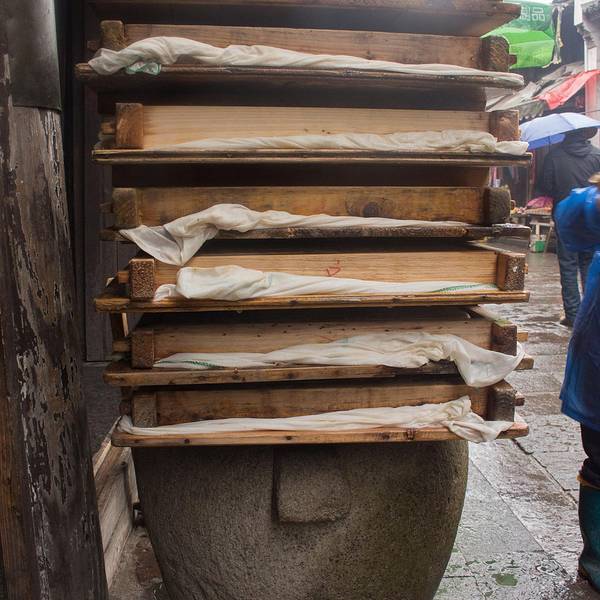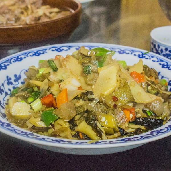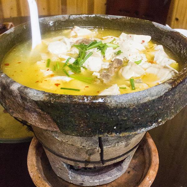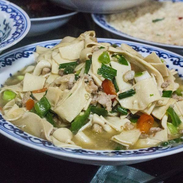 豆腐是廿八都的一大特色,古镇里有家很有名的叫隆兴斋的酒家,专门做廿八都的豆腐。 店外就可以看到店家做的豆腐,上面都精细的印有廿八都的字样,六到七排豆腐压在一起,起定型和挤压水分的目的。古镇上酒家很多,只有这家生意格外火爆。店里的所有菜都写在竹牌挂在了墙上,古色古香。黄豆炖猪蹄门口的豆腐,加上鸡汤和排骨,放在石头锅里小火慢炖。江山当地的菜肴有些类似于江西菜,和苏杭清淡的口味不同,更偏向油辣小炒。 冬腌菜炒冬笋片最爱的炒地衣除了豆腐,豆皮也不错,后面的是豆渣,简直是全豆宴