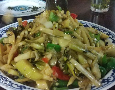 游好江郎山后,驱车来到廿八都古镇,住农家客栈,对面就是隆兴斋,看了点评还不错,晚饭就定在这家。店堂古色古香,八仙桌长条凳,墙上还有若干名人摄制组合影照。点了廿八都特色菜,上菜很快,菜品量足,口味偏辣应该是江山特色吧。 【红烧汪刺鱼】鱼不大,野生的吧,鱼肉细腻鲜美入味,不错。 【红烧豆腐】豆腐是廿八都地方特色菜,好多做法,选了最简单的红烧。烫嘴的豆腐,真的很好吃,有别于我们常吃的内酯豆腐,有质感又有一丝烟火味,得到在座的一致好评。 【铜锣糕】古街上都有卖,绿色圆形真空包装。饭店上来的是将其切片,在油锅上小火煎至两面略有金黄。口感软糯,带有艾草清香,作为地方特色,还是有担当。 【观音菜】老板娘推荐,菜叶带紫色,口感略有一点滑滑的,菜叶很嫩 ,味道不错。想起多年前在福建旅行时,在饭店吃了这菜,马上又点一份的,果然廿八都接壤福建,蔬菜都有同款啊 【野笋咸菜】野笋很嫩,和咸菜炒一起,特别鲜。 【燕皮馄饨】也是特色,但吃了感觉名称相同,但和福建的燕皮馄饨还是有差距,不怎么样。 四人六菜加啤酒小劲酒供消费206 算得上物美价廉。