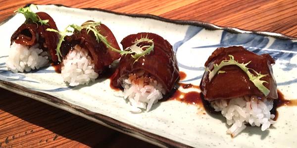 梅菜扣肉寿司:是逸谷会的招牌菜之一,灵感源自日本寿司,以经典客家菜梅菜扣肉代替生鱼片,取广东惠州的梅菜搭配肥瘦相间的扣肉,放在温热的米饭上,酱汁入味,一口一个,滋味无穷!