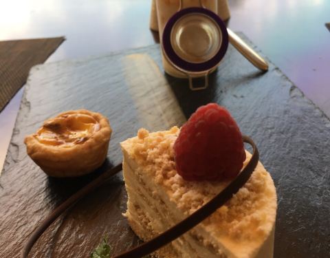 旅游学院教学餐厅~学校位于山上,餐厅是学校的实习餐厅。最近这餐厅装修到9月,目前用餐在望厦宾馆内。用餐环境不错。服务大都是年轻人,热情,周到。中午的行政套餐200一位,还没有服务费,食物的口味也很好,性价比很高的一家餐厅。前菜三文鱼研制的入口有质感,配的腌制酸甜的水果粒开胃解腻。羊膝肉软烂入味,咸淡合适,突出羊肉的鲜味。薯球估计加了糯米,软糯的感觉第一口还没吃出来是什么。这主菜量可真够大的,分享合适,感觉一人吃不了。海鲜饭内容丰富,鱼肉、贝类、鱿鱼、虾,饭粒软硬适中,汤汁入口愉悦。澳葡传统甜品,芒果布丁突出水果的酸甜和蛋奶的香滑;蛋挞甜而不腻,一口酥恰到好处;木糠布丁层次分明,入口即化。总的来说,很满意的一餐,为了吃这家因为有事换了两次时间,美味不怕晚,吃到了就是满足!