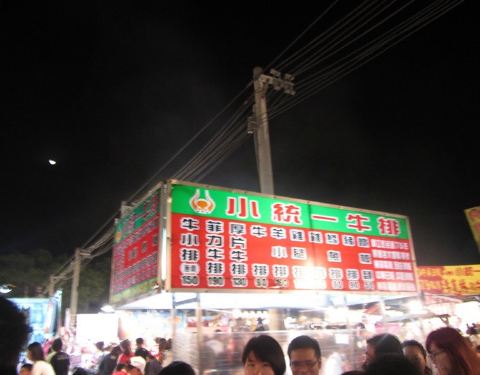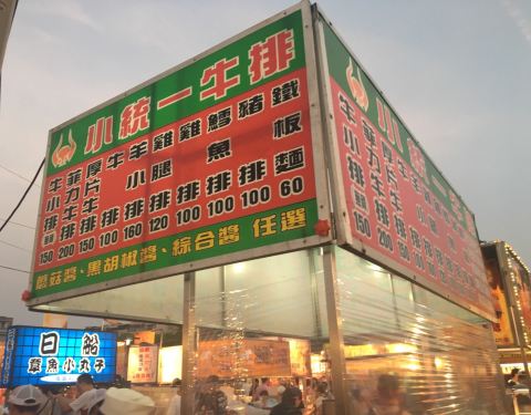 小统一牛排在大东夜市和花园夜市轮流排摊。一、二、五在大东夜市,四、六、日在花园夜市。它家的牛排是铁板烧的方式,很厚切。但夜市这种地方,肉的质量当然比不上餐厅里的日本或者澳洲牛了。