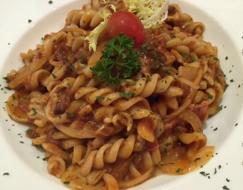 蕃茄腸仔螺絲粉:今次這個蕃茄粉做得很好吃,甜中帶點酸,好味。