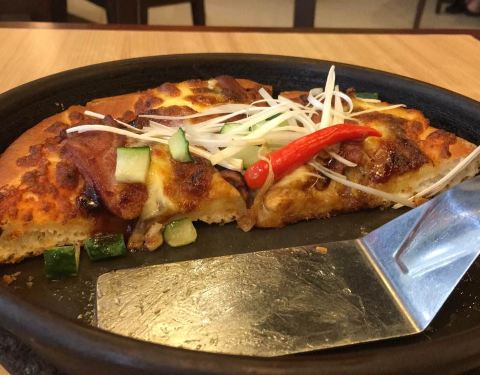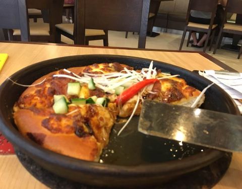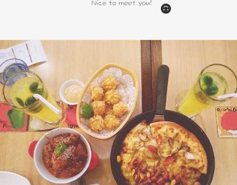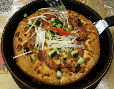今天点明星套餐,圆梦呀哈哈。还蛮好吃的。可以海鲜披萨没有啦,换了啥烤鸭肉,还不错吧水果沙拉和冰淇淋好吃。就是午餐时间要等比较久。人多位少。