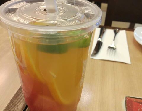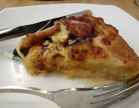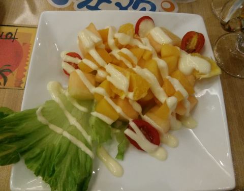 - 还蛮好吃的。可以海鲜披萨没有啦,换了啥烤鸭肉,还不错吧水果沙拉和冰淇淋好吃。就是午餐时间要等比较久
