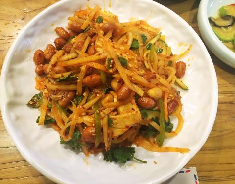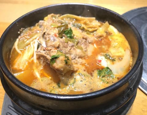 不同于一般韩餐,这家餐厅主打的是脊骨土豆汤,每一块脊骨肉都沁透了汤汁,肉质口感软硬适中。最赞的是它的汤汁,喝下去的时候,首先冲击味蕾的是咸鲜,然后有一点点恰到好处的微辣,配以淡淡的苏子叶味道,让人忍不住喝了一口又一口。