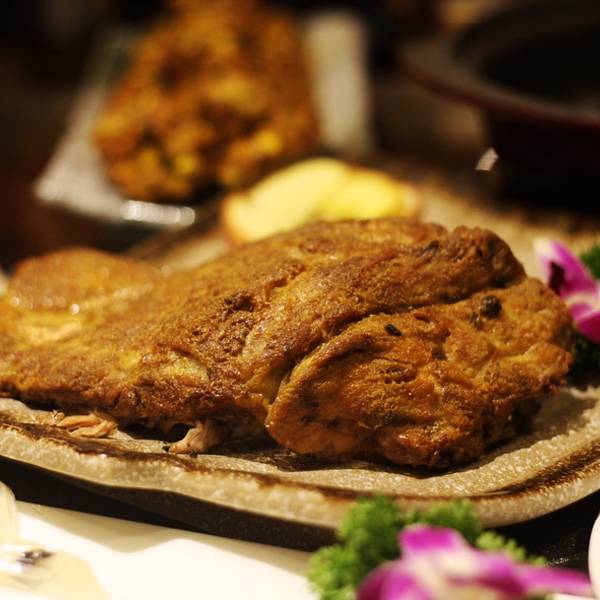 - 锅包肉,这家是黄桃版的,绝对比玉氏滋味馆的好吃,肉炸的好,挂汁之后皮还是脆的。特别精彩的演出金骆驼