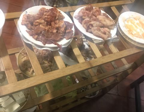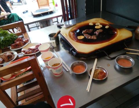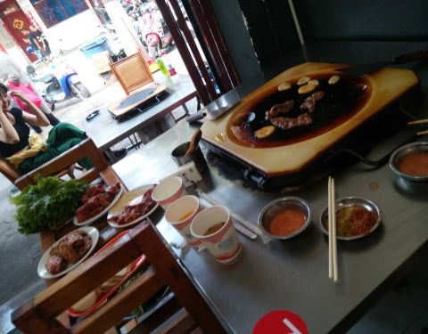 阿昌石板烧在当地大理古城很有名气,排队的人越来越多,都去网红餐厅尝尝味道。 这家店有两层楼,我们坐在楼上的位置,每桌可以坐四个人,点了相同的菜,自己做了大厨来炒菜,用油,盐,孜然等来调料,味道还是不错的。