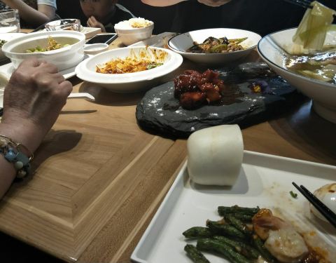 酸辣汤像老干妈调的辣椒水,油爆虾除了外面的皮过于甜之外没有任何味道,真的很好奇厨师是怎么做到的,那味道简直坑爹。最让我理解不了的是身为一个厨师难道不知道做虾要除虾线吗?可能真的是我孤陋寡闻了吧,之前吃过一次觉得很不错的梅干菜炒饭这次也是味道和上次大不一样,可能换了厨师?小炒皇有点水口感一般,土豆丝酸酸的很爽口,四喜丸子很好吃,是这次最成功的一道菜了多少算一点慰藉吧