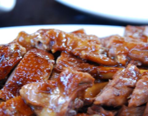 ...鸭肉,上面沾满了酱料,熟度正好,既保持了鸭肉的口感,又不失绵软,最重要的是一点也不膻,堪称一绝