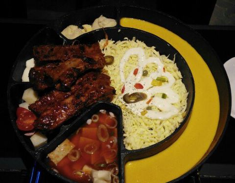 3个人买了一个178的团购,包含芝士肋排火锅一份,鱼籽炒饭一份,部队火锅一份,冰柠茶一份。芝士不错,拉丝可以拉好长好长,第一二根肋排如果你不会卷服务员会主动上来帮你,教你怎么卷。然后告诉你吃完了肋排再叫他们,会来帮你炒饭。鱼籽炒饭也不错,鱼籽很多,吃起来好爽。部队火锅的年糕非常Q弹,方面便煮很长时间也不会烂。三个人吃178的套餐正正好好,唯一遗憾是肋排只有5根,如果是6根就好了,现在有点不够分。很喜欢肋排芝士锅里的南瓜粥,有奶油的香味,可惜太少。另外要吐槽一下,多人份的团购餐,为何饮料只有一份?这是要给谁吃啊?总体来说人均还是挺划算的,一个锅也就是3人吃最多了,4人吃就嫌少了。唯一的定量,不够合理。