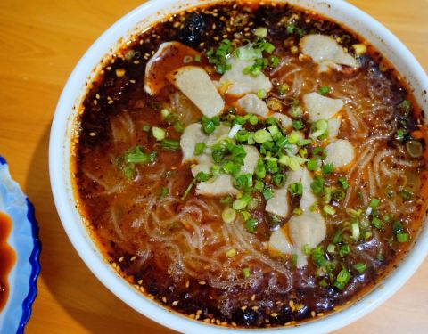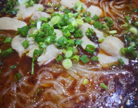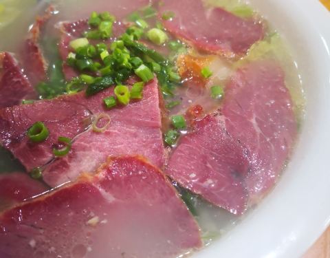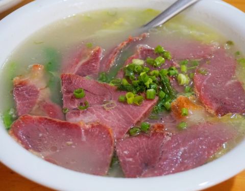 去拍银杏的路上饿得都有点说不动话了,还好JM机智马上搜了附近的好吃了,即刻驱车前往。 一点过的样子。过了饭点时间,店里也没其他客人,男老板儿好像很不想做我们生意似的,语气不耐烦,可能是怪我们打扰他的休息时间了。 【牛肉汤】中份20,30,有两个价格我是没有看懂。汤头居然是肥肠汤呃,很香浓。牛肉切薄片,蘸水够巴适,怎么都好吃。里面素菜豌豆尖儿很安逸啊,就是太少了,莲白比较多。 【拌肠头】30,比起肥肠,肠头口感更软,而且没有那种味儿。分量还可以,嘿多芹菜,微甜麻辣,好吃!【拌拐肉】14,这种肉即使肥点也不会腻,像筋一样。味型和拌肠头差不多,非常下饭! 【肥肠血旺】小份14,血旺超嫩,入口即化,红油鲜亮,香味扑鼻。就是汤汁太多,如果干一点就好了。 【肥肠粉】小份8元,一份不够我们又加了一份,手工红薯粉,软滑香糯,油辣子很香,他家的油辣子果然是主要角色,非常优秀。汤头依然是肥肠汤,吃起来就是入味又好吃。JM是连汤汤都要喝干净的节奏啊。 这里消费真不高,人均20+吃得舒舒服服。就是没有服务意识【蘸碟】2元一个也没有提前说,而且是没有点直接端上来的。