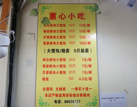 隐藏在大关居民楼边上的蕙心,如果不是在大众点评网上看到好多大V的好评,住在附近多年的我根本不知道有这样一家店。 沿着德苑路一直往里面走,看到大关科普公园,再往前走一会儿就能看到。 店里环境一般,毕竟来...隐藏在大关居民楼边上的蕙心,如果不是在大众点评网上看到好多大V的好评,住在附近多年的我根本不知道有这样一家店。 沿着德苑路一直往里面走,看到大关科普公园,再往前走一会儿就能看到。 店里环境一般,毕竟来这里不是吃环境的。晚饭时间生意真好,拼桌都要找位置。 大馄饨,小馄饨,烧卖都是现包的,价格不贵。要了一笼笋尖烧卖,等了好一会儿才送过来。 筷子,碗碟,要自己去拿。烧卖个头很大,比景芳周大姐的烧卖大了一半,味道也不错。配了碗汤,味道很淡。 下次过来吃好评如潮的蛋黄大馄饨。