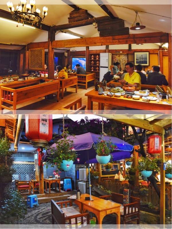 👫我们快7点到餐厅时几乎已经满座了,不多一会儿门外就排起了长队,店内装潢非常有丽江风情,墙上有各种明星来用餐的照片,小小的庭院里鲜花簇拥,鸟语花香,坐在室外用餐也是极美好的~