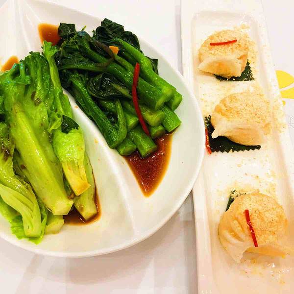 瘦肉皮蛋粥、韭菜煎锅贴、脆皮虾皇饺、龟苓膏、白灼蔬菜双拼