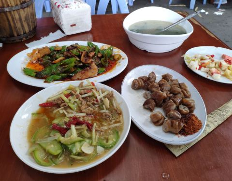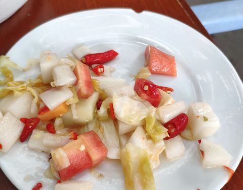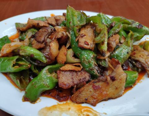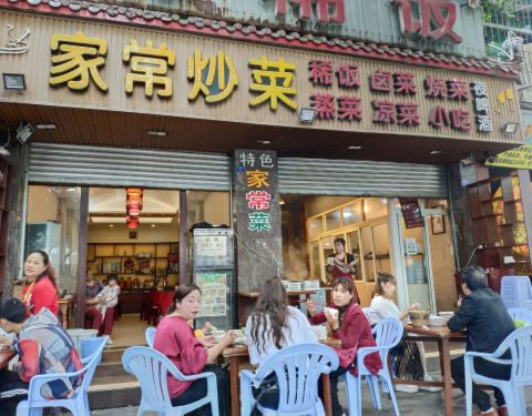 五一放假不想去人多的地方,发现新繁有个冷门景点东湖。到东湖已经中午了,就在附近搜到这家餐馆,走几分钟就看到了。餐馆在一条小路上,旁边还有几家小吃,有叶儿粑和牛肉豆花等等。 [环境]这家在路口的第一个,铺面较大,里面坐了不少人。门口也摆了几个桌子,我们选了门口坐,装修看上去很普通。 [服务]打菜的阿姨很热情,店员还赠送了汤和泡菜。 肥肠油没有扯干净,然后是微波炉打热的。 青椒回锅肉还可以,打70分。 还拼了一个韭黄炒肉和西葫芦炒肉,味道还行。 两个人吃了50多,性价比还可以。