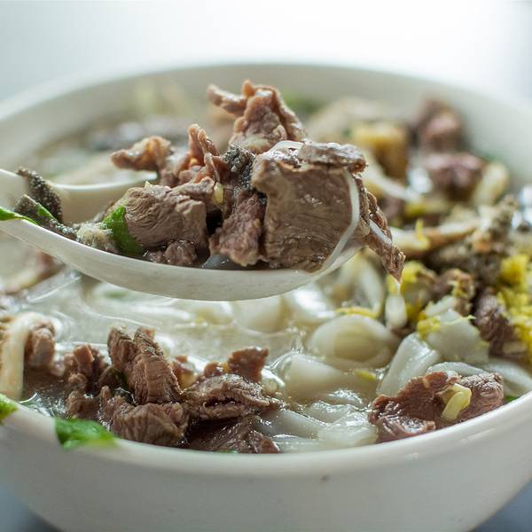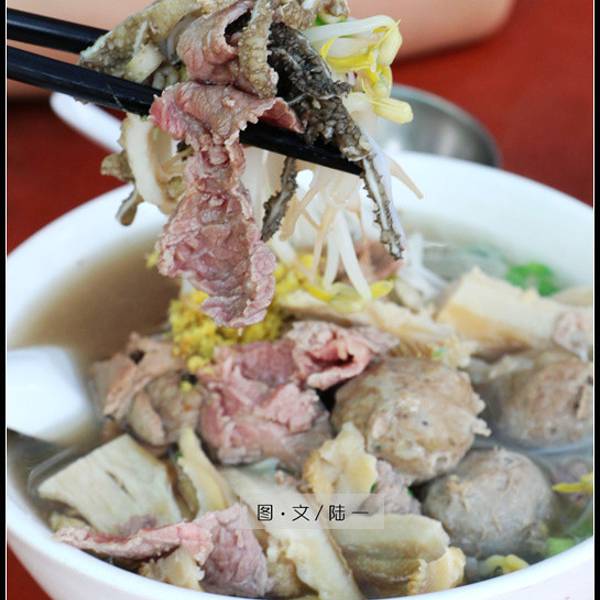 【位置】 正对西湖的环城西路上开了3家牛杂粿条店,依次排开,左右两家都装修的很好。中间这家看着不起眼的才是。 【牛杂粿条大份】40元 份量真的太足了,完全噗出来的感觉。配料有:牛肉片,牛肉丸,牛肚,牛百叶,牛心,牛肝,牛舌,牛腰……我给它起名——牛一切 看了一下制作程序,有着弥勒佛大肚的掌勺老板果然很有经验。先是把牛肉片还有牛肚牛百叶这些,稍微在滚沸的浓汤里略断生,捞起后,牛肉片尚乘粉红色,这时候牛肉片血水已经锁住。配料全部码上以后,最后再浇一勺滚烫的汤汁,让牛肉片瞬间熟透。充分保持了鲜嫩口感。真的讲究。 其他牛各部位的食材都特别新鲜,完全没有异味。 临走时还特意打包了两包真空包装牛肉丸,一包是一斤,50元。回家试过煮和蒸两种方式,蒸风味更浓郁。这家的牛肉丸还别家吃的不太一样,不知道调味时是否有放蒜蓉汁,比其他家吃到的味道更浓郁,特别好吃。 TIPS:这里可以支付宝或者微信支付。