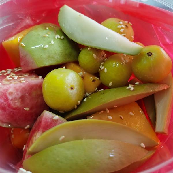 平常日子8、9点也不用排队,超级开心!早起必须要来一份必吃榜镇记牛杂!清水烫牛杂、牛肉和肉丸,加一些豆芽,撒上葱花,淋一点辣椒酱,美滋滋!!!粿条就是扁长的米线,早起一份超赞!旁边杂货店买了一份甘草水果。吼吼吃!因为奈雪的茶北方人民知道了油甘,潮州到处都是!!单吃先涩涩的,之后回甘,但是淋上甘草汁,天,一口入魂!!从此爱上,连果汁冰都要喝油甘的hhh杂货店老爷爷还给喝了一杯功夫茶,好亲切,好爱潮州!小圆球就是油甘