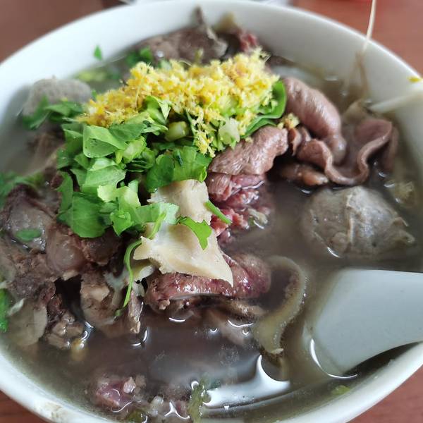 刚从澳门吃完牛杂回来,相比之下潮州的牛杂性价比好高。十几块能给上一大碗,满满都是肉,份量感人。隔壁小破门头和这家环境好的店都是一家人干的,貌似父子关系,差别是这家汤头略清,父亲做的那家则较为浓郁,喜欢哪种看个人口味。我去吃的时候略有些晚,隔壁门头已下班,选择大店饱餐一顿。 进门吧台付款点单后会给一个数字牌等待叫号,我选了靠近一楼窗户的桌子坐下,不到10分钟就有人上餐了。 「牛杂粿条」挺大一碗,下面是粿条打底(也可选择粉),上面铺满各种牛杂,吃起来就是很纯粹的肉香,味道很棒! 有机会再去试试其他家,听本地土著朋友讲其实潮州很多家牛杂都做的很好吃,这家生意很忙是因为被美食栏目和网络炒红了。不管咋说,我觉得吃起来还不错的。