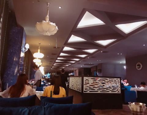 地理位置不错,在金沙湾也是高消费人群距聚集的地方,餐厅环境也好,整体布置不错,而且有半自助,种类也多