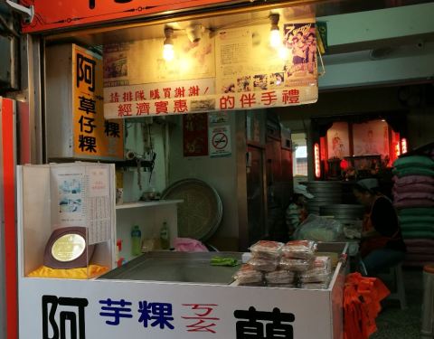 又是一家永远需要排队的小吃店。几乎每个游客在经过阿兰草仔粿的时候都会停下来,等一会。不过,这家店的效率可是非常高哦。一人负责做,一人负责包。五分钟之内,绝对能拿到。所以,不用害怕时间长,放心大胆的等好了。外层的青稞皮Q弹中还带有青稞淡淡的想起,里面还有多种口味的馅料。香甜的红豆,微咸的菜蒲米,多种口味,再挑剔的人都能找到最喜欢的那款。还可以带包外带,当作伴手礼送给亲朋好友。草仔粿、芋粿、菜蒲草仔粿,每样都拿几份,就冲着这口味,就一定不会让你丢脸哦。