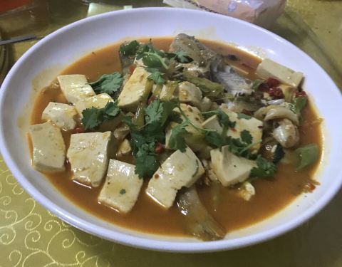 这家餐厅是昨天晚上去吃的,也是看了评价后选择了这家,餐厅不算大,里面有两个包间,我们20多人正好两桌,结合网友的评价点了冷水鱼,五道黑,还有羊肉汤,牛肉粉丝煲等,吃下来鱼确实不错,肉质鲜嫩而且不是很腥,另外羊肉汤也不错,里面的羊肉很大几块,吃起来很是过瘾,值得一提的是他们家的煲饭,这个饭是大家一致吃下来都说很好吃,总体吃下来这家确实不错,人均60左右也不贵,性价比很高