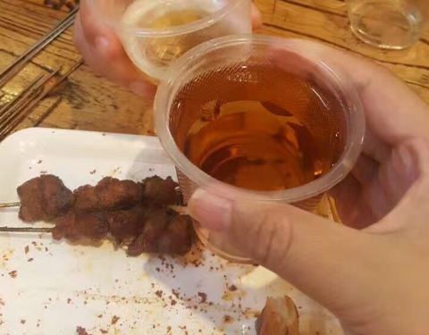 - ...那个眼镜,这家烤肉店还是很接地气的,味道不错,羊肉串,羊头肉,还有果味啤酒,就是我们小时候喝的