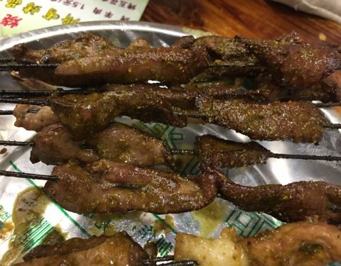 - 好多菜都没了,老板一听我们是两千公里以外来的,就给我们从给哥们留的串中匀给我们点,烤筋是酸辣的有特色