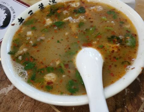 跟着单位里组织的小团队到坝上旅游,住在附近的酒店里,早上早起晨运时,从酒店大堂小妹口中打听到这个老字号的餐馆,便放弃酒店自助早餐步行10分钟寻觅了过去,两个人过去吃了羊肚汤、羊杂汤和北方烧饼,果然弄得很干净,膻味也不重,确实味道鲜美! 后来我们上午去坝上,直到下午两点三刻才吃上午饭,其他团友都饿憋了肚子,我们却硬是扛了下来,应该就是这羊汤的功劳了!
