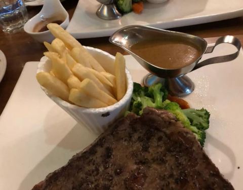 一家很正宗的西餐厅,团购了双人餐,土豆沙拉造型不错,味道也很棒,牛油果虾卷味道稍微有点淡,但是馅料充足。牛排要的七分熟,肉很嫩,甜品味道也不错,奶油一点也不腻,很清爽。