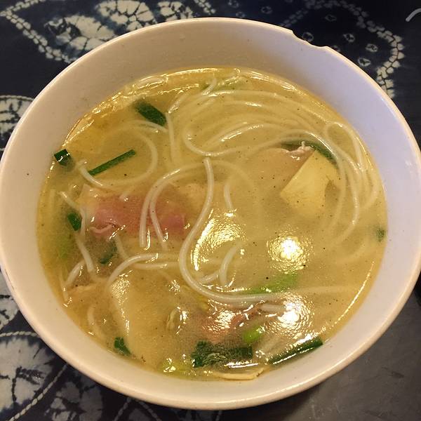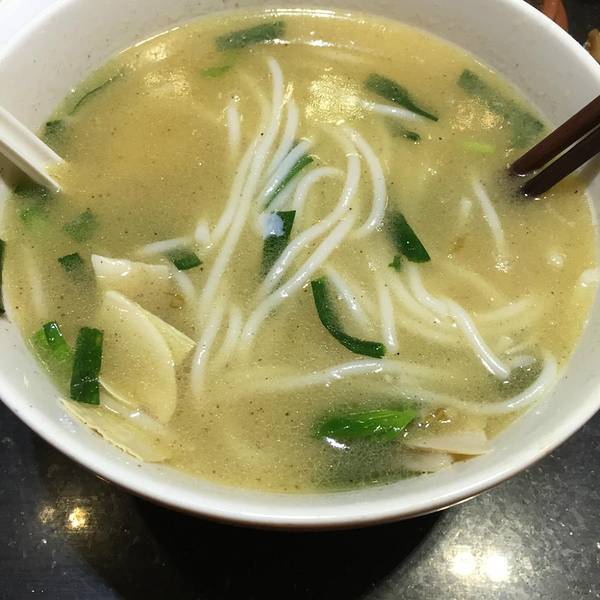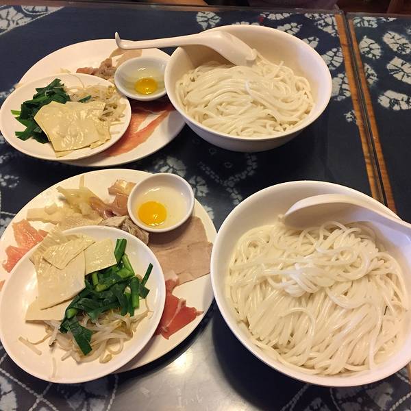建新园的过桥米线就这么低调被端上来了,既没有想象中的火锅,也没有期待的气泡翻滚。 精致的鹌鹑蛋和几片肉,完全是生的,正在思索着该怎么吃,服务员把一大碗泛着油偶尔冒着泡的汤也端了上来。“先放肉和调料,最后放米线。”服务员端走托盘的时候提醒。不知道是看我是外地人茫然的样子,还是职业习性。我先把生肉和蛋放去烫了一会,才放熟的材料,强迫症地捞起肉咬开看熟了,最后才放米线。看着清汤寡水的样子,但这完全就是广东人的口味,滚烫的汤里还有胡椒的辛辣。 过桥米线柔韧爽滑,像小桥流水的温柔细腻,对得起它的盛名。