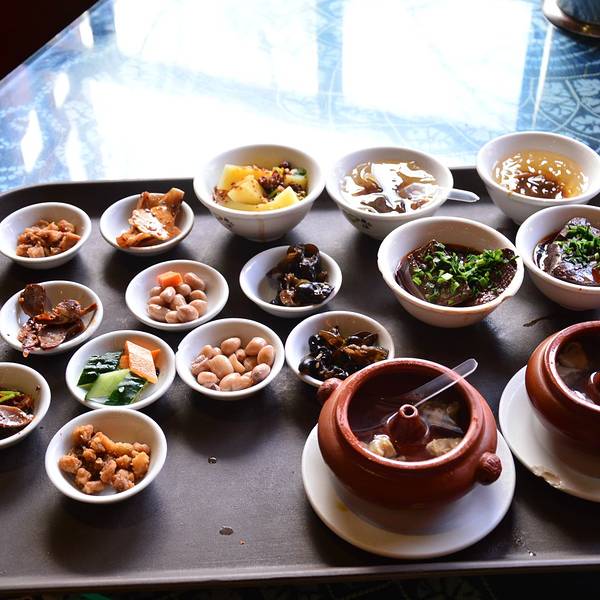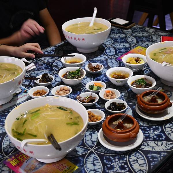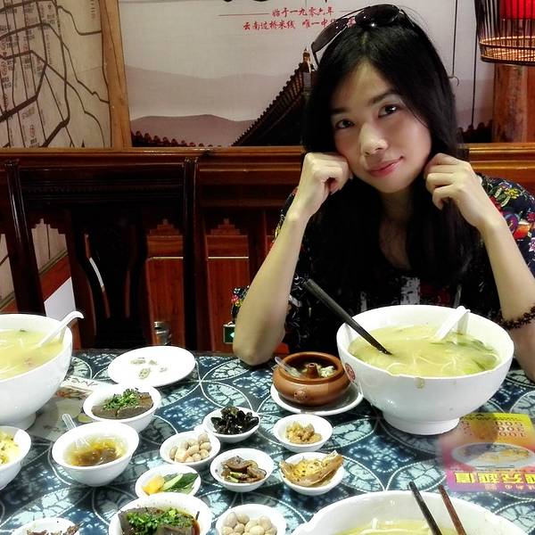 我们选择了吃货们心心念念的百年老字号宝善街建新园。建新园于1906年建立,原名三合春。1952年公私合营成立后更名为建新园,以后一直沿用此名,在同行业中享有很高的知名度,是至今云南经营过桥米线市场上最正宗的一家,其独特的风味,吸引着中外众多食客,被誉为宝善街“第一金字店”。——源自度娘排队等位,十足比脑袋大的海碗,十几道小菜,小盅汽锅鸡,荤腥搭配,正宗云南过桥米线。汤滚热,先生后熟,一样一样全部自己下到滚汤里去,焖熟,开吃。25人民币/位。分量足的让老基们惊了下巴(⊙o⊙)噔噔噔~锵~~