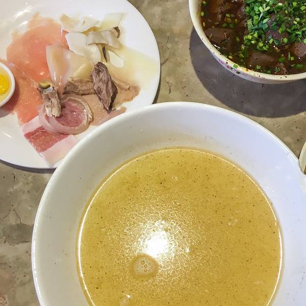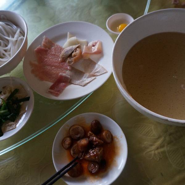 精致的鹌鹑蛋和几片肉,完全是生的,正在思索着该怎么吃,服务员把一大碗泛着油偶尔冒着泡的汤也端了上来。“先放肉和调料,最后放米线。”服务员端走托盘的时候提醒。不知道是看我是外地人茫然的样子,还是职业习性。我先把生肉和蛋放去烫了一会,才放熟的材料,强迫症地捞起肉咬开看熟了,最后才放米线。看着清汤寡水的样子,但这完全就是广东人的口味,滚烫的汤里还有胡椒的辛辣。