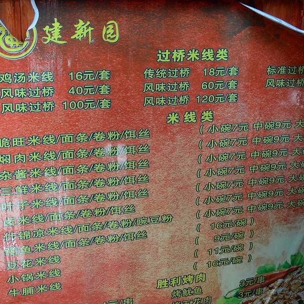 过桥米线,想必我们都经常吃,但是感觉和桂林米份没有多大区别,终于去了一次云南,品尝了一下地道的云南过桥米线在昆明,我们来到了百年老店建新园,据说始建于1906年,到今年正好110年,可是货真价实的百年老店...过桥米线,想必我们都经常吃,但是感觉和桂林米份没有多大区别,终于去了一次云南,品尝了一下地道的云南过桥米线在昆明,我们来到了百年老店建新园,据说始建于1906年,到今年正好110年,可是货真价实的百年老店。百年老店建新园进到店里就是一个接待台,墙上和台上都有价格,朋友推荐我吃的鸡汤米线,16元1套,就点它了。我们可是4个人一起来的,就想点4种不同的风味,于是丽丽点了标准过桥米线25元,还有两位男士,分别点了40元风味米线套餐和60元的风味过桥米线套餐.米线价格套餐价格单店内大厅百年老店建新园好了,上菜了,这个有鸡肉的盘子是 鸡汤米线的配料25元的标准米线套餐,除了配菜不一样外,还多了一个鹌鹑蛋。这就是60元风味米线套餐的配料了,分别用小碟子盛装起来,你能认出是什么菜品吗?我看到有两个鹌鹑蛋,还有火腿,海鲜?比鸡汤米线的配料要丰富多了。看看这个大合影,米线还未上,先上配菜,这样装着也赏心悦目。这一大盘装的就是风味过桥米线的小食了,原来是40块、60块的过桥米线套餐,多的就是这些配菜呀,这下你知道了吧, 有汽锅鸡汤噢!要趁热喝。米线和汤底都上来了,一大碗滚烫的汤,服务员要我们把配料倒进去烫熟,要讲究一个及时,不能等拍照,因为汤不热了就烫不熟的那些配菜了。于是我们纷纷的把那些豆芽啊,鸡肉啊,火腿啊一股脑倒进碗里,然后米线也倒进去,稍微搅拌一下,然后呢就可以吃啦!生的鹌鹑蛋放下去,烫一下,嫩滑可口,汤底有胡椒,热辣热辣,这个味我喜欢,相当喜欢!好好吃,这就是地道的云南过桥米线!味道比照片好。