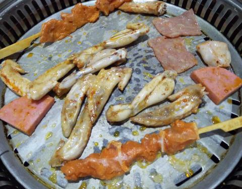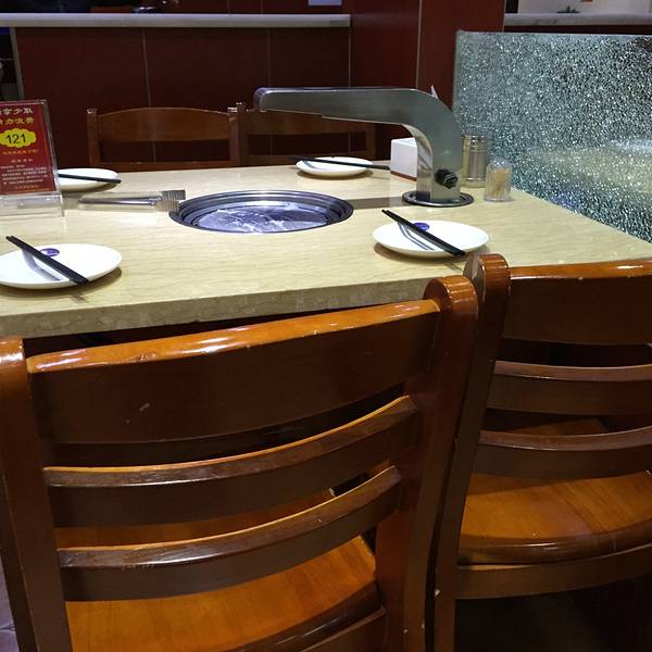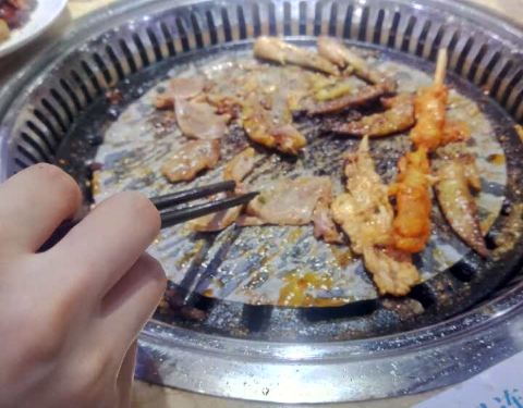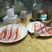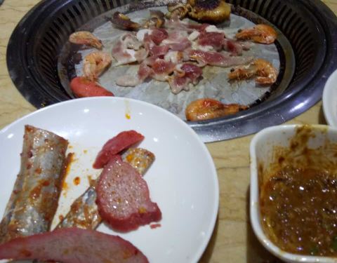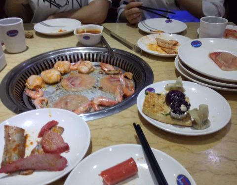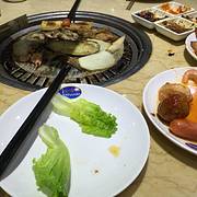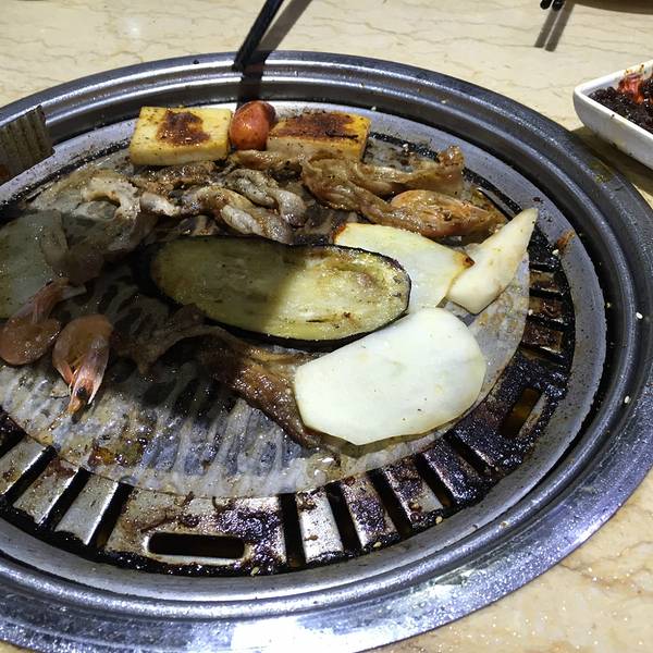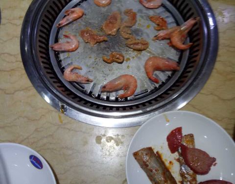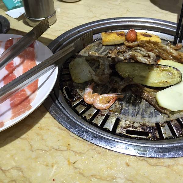 这次终于提早在11点25的样子到了,一到店门口就说取号,工作人员居然说“现在还有位置,可以直接进去”,真是开心翻了。在前台兑换了39.9元的午餐团购码之后,就可以直接进店坐下了。(PS:基本都是团购的,我们之后还来了6个人,也是在前台兑换团购码的)晚餐会要贵个10元左右。店里6人座是沙发椅,一个烤锅。安排我们坐的是这种木凳子的4人座,不过也是一个烤锅,不错。其实就是纸上烤肉,蛮卫生干净的。盘子也很干净的。烤肉嘛,种类很多的。生食呢,烤五花、腰花、鸭胸肉、鸡腿肉、鸡翅膀、丸子、烤肠、基围虾等等应有尽有;熟食的话,炒肉、炒饭炒面、包子饺子、面包点心、烤扇贝(凭小票一人一个)、蒸紫薯、汤类、石锅饭等等都是有的。饮料有西瓜汁、黄瓜汁、橘子汁、咖啡奶茶等,很丰富,还有冰激凌。烤了很多,最爱吃的还是烤五花,因为本身就可以烤出好多油,然后放上茄子、红薯、土豆和基围虾等吸油的,相得益彰的感觉,都很好吃。吃腻了就再配上生菜,将肉卷在其中,咬一口真是美味极了。