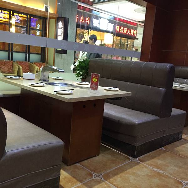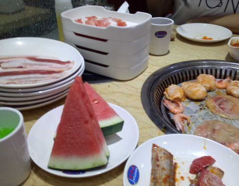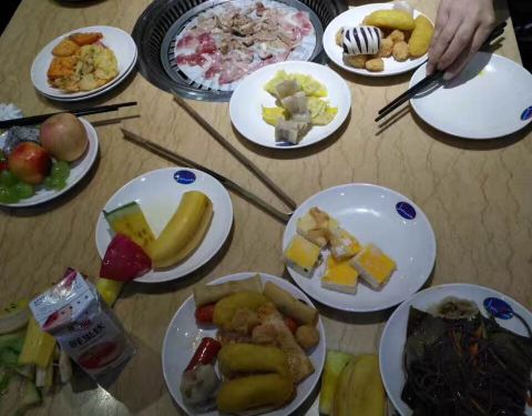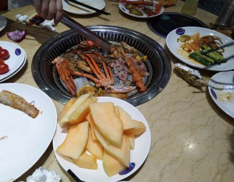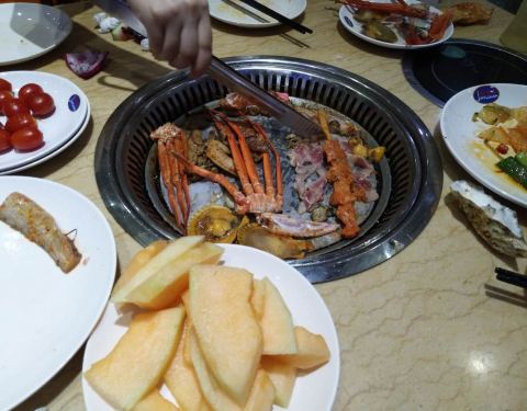 【餐厅环境】店内环境挺不错的,餐桌很多,收拾得很干净。沙发椅子很宽敞,坐着很软。烤肉的架子是一个圆形的,上面有吸油烟的抽风机,在侧面有开关按钮可以控制火候大小,操作很方便。【菜品口味】店内饮食种类相当丰富。熟食的味道很可以,刚开始拿了很多的鸡翅啊香肠各种,还没开始就半饱了。调料有好几个口味的,辣椒酱、番茄酱等等。吃得最多的是五花肉,五花肉也是最热门的食物,吃完之后又去加了几份。海鲜有熟食的,也加了点生的基围虾,第一次吃烤基围虾哦。新发现的鱼烤的非常好吃,肉可以撕成一条条的,灰常棒。对于肉食主义者来说,这家店真的是很满足的。水果的话,西瓜、哈密瓜、火龙果、柚子,苹果等等都有,火龙果是个人最爱。除了食物以外,还有各类饮料、酒水,甜品也不错哦,冰淇淋是自助式的,有冰激凌机可以自取。